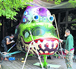 Fünf Künstler, die in unterschiedlichen Techniken arbeiten (Graffiti, Airbrush, Fasermaler, Pinsel), rückten mit Kisten voller Arbeitsmaterialien an und verwandeln den Hubschrauber auf ihre jeweils persönliche Art und Weise. Mittlerweile zeigt er vorn schon seine „Zähne“, wilde Fabelwesen aus Science-Fiction-Filmen turnen über sein Gesicht, das Gehirn liegt offen. Eine Menge Spraydosen wurden dafür bereits geleert. Vom noch vom Bösen verseuchten Kopf weg verwandeln sich die Wesen, in freundlichen Farben fliegen Vögel und Schmetterlinge über den Rumpf.